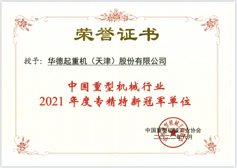 近日,中国重型机械工业协会授予华德起重机(天津)股份有限公司“中国重型机械行业2021年度专精特新冠军单位”荣誉称号。